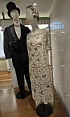 The focus is on the museum’s ‘beads’ frocks from its textile and fashion collections, with cubicles (former swimming pool changing rooms) on the first floor housing expertly woven jacquard fabrics and damask materials “with shimmering patterns as well as some day and evening wear”.
